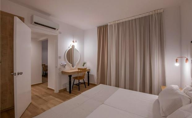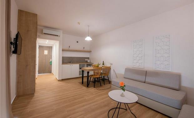 - Family Room/Side Sea View/Sea View (44 кв. м, вид на сад/боковой на море/на море, макс. 4 чел., двухкомнатный, гостиная и отдельная спальня, есть межкомнатная дверь, 2 односпальные кровати 90х200 см, доп. место 2 дивана 80х195 см, напольное покрытие – плитка, балкон/терраса, 2 ванные комнаты с ванной)