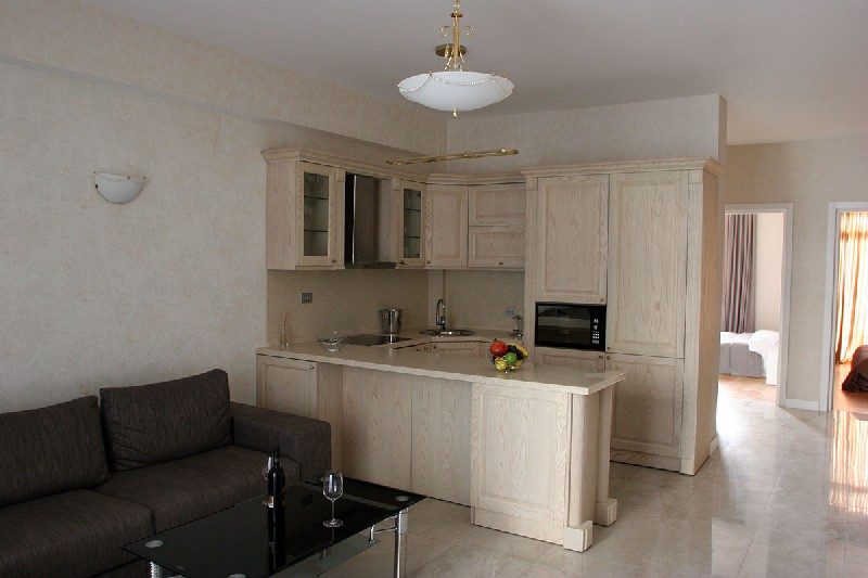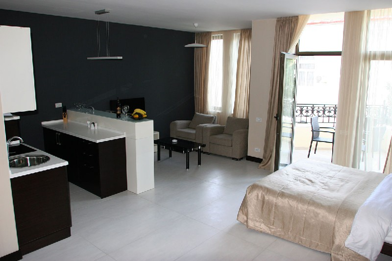 Корпус (8 этажей, лифт, 100 м до пляжа): 2-местный Superior room, 2-местный Studio, 2-местный 2-комнатный Suite, 4-местный 3-комнатный Executive suite.