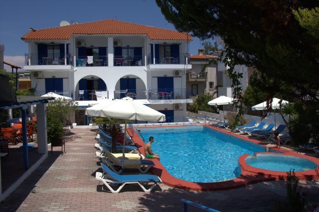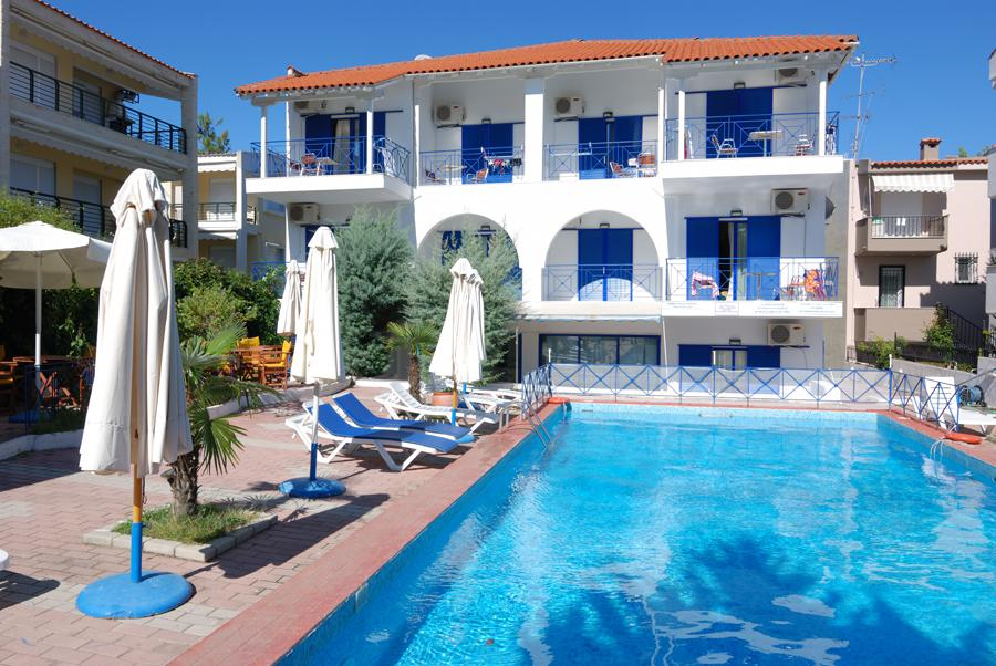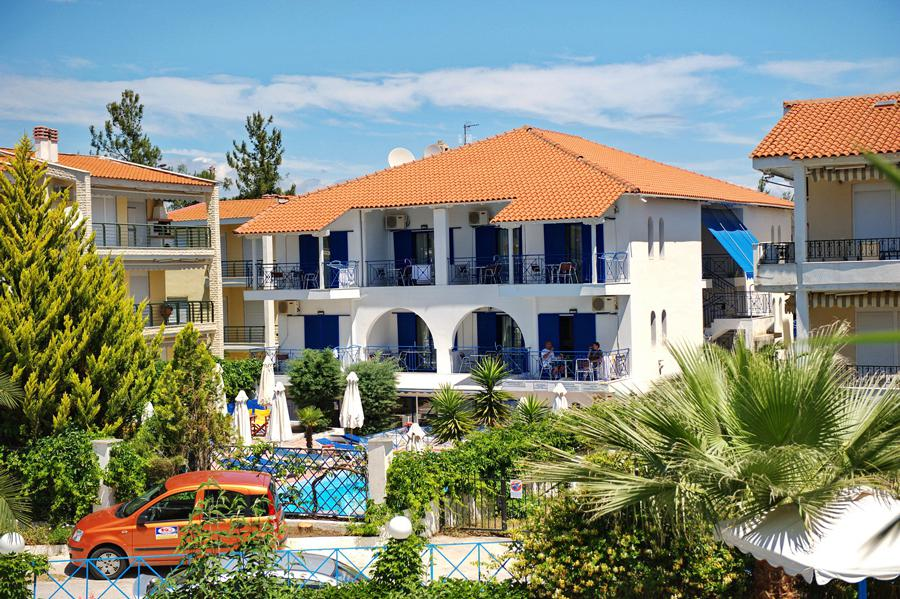 Отель Macedonia Sky (Македония Скай) 2* расположен на полуострове Халкидики в Греции, в 90 км от аэропорта "Македония" города Салоники, в поселке Ханиоти, в 250 метрах от песчаного пляжа.