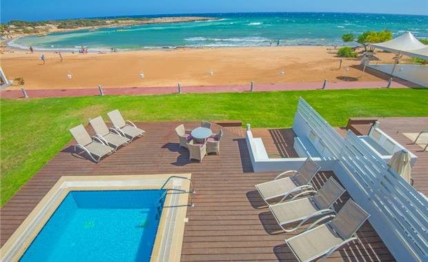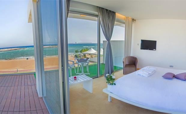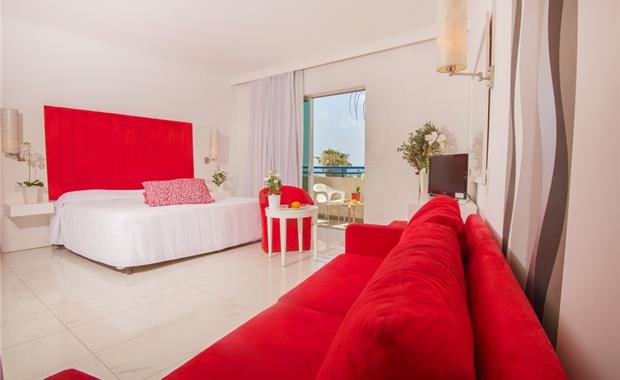 - Royal Suite Front Sea View (85 кв.м, расположен в тихой части отеля, имеет вид на Средиземное море; люкс расположен на два этажа - цокольный и первый; на первом этаже есть гостиная с диваном-кроватью, обеденной зоной и туалетом, а на втором этаже - большая спальня и ванная комната с джакузи и отдельный душ; имеет частный бассейн с деревянным настилом и травой, макс. 4 взр. / 2 взр. + 3 реб.)