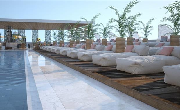 - терраса для загара с шезлонгами и зонтами