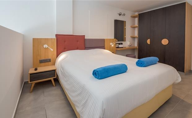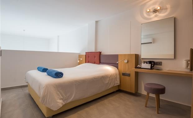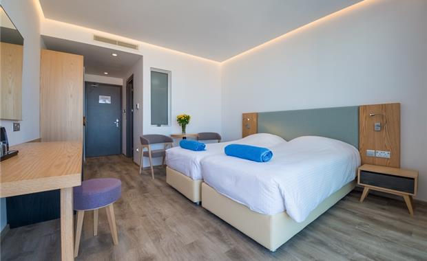 - Double / Twin Sea View (24 кв.м, однокомнатный номер с одной двуспальной (2,0x1,6) или двумя односпальными кроватями (2,0x0,9), доп. место - раскладной диван (1,9x1,5), балкон, вид на море, макс. 3 взр. / 2 взр. + 1 реб.)