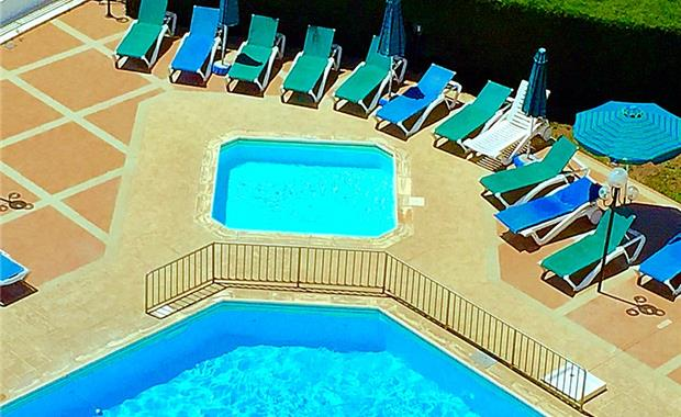 - шезлонги и зонты около бассейна