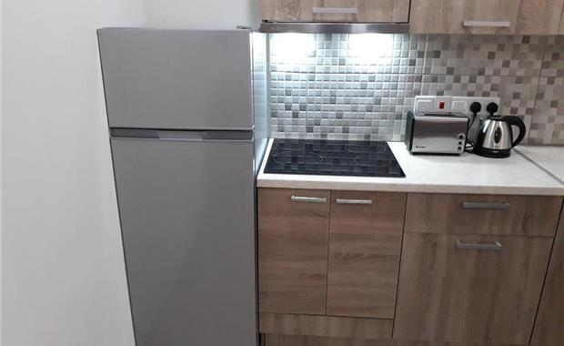 - мини-кухня (холодильник, кухонная плитка, электрический чайник, тостер, посуда)