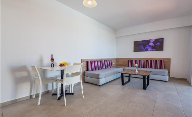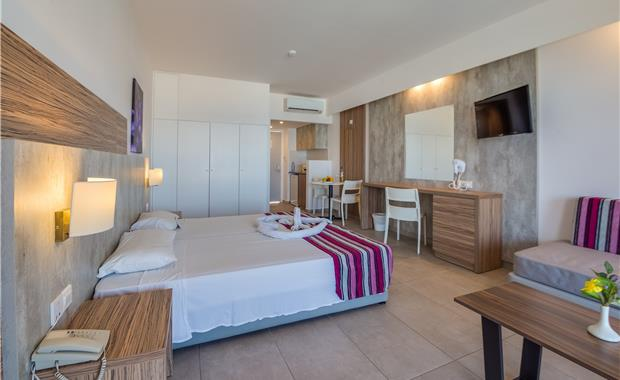 - Family Room (45 кв.м, двухкомнатный номер с боковым или прямым видом на море; спальня и гостиная, две односпальные кровати (90*200) / 2 дивана (195*80) / детская кровать (57*115);