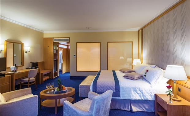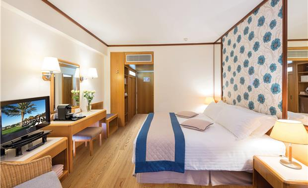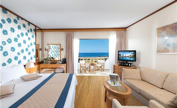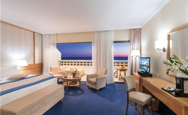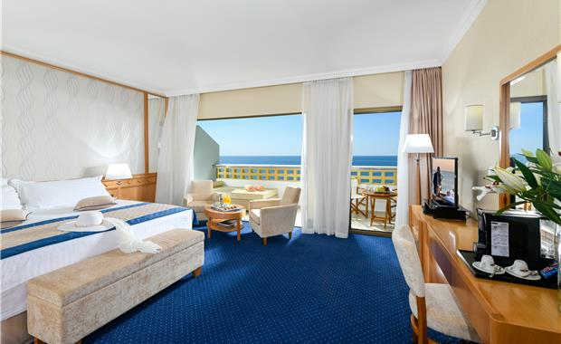 - Junior Suite Land View / Sea View (35 кв.м, номер с просторной гостиной зоной и спальной, ванная комната с ванной и отдельной душевой кабиной, балкон с видом на Средиземное море или красочные сады отеля; к услугам гостей: бесплатный Wi-Fi, DVD-плеер, эспрессо-машину, роскошные туалетно-косметические принадлежности в ванной комнате, поздний завтрак до 11:00 и пользование собственной кабиной для переодевания на пляже с зоной отдыха и шезлонгами; макс. 2 чел.)
