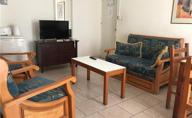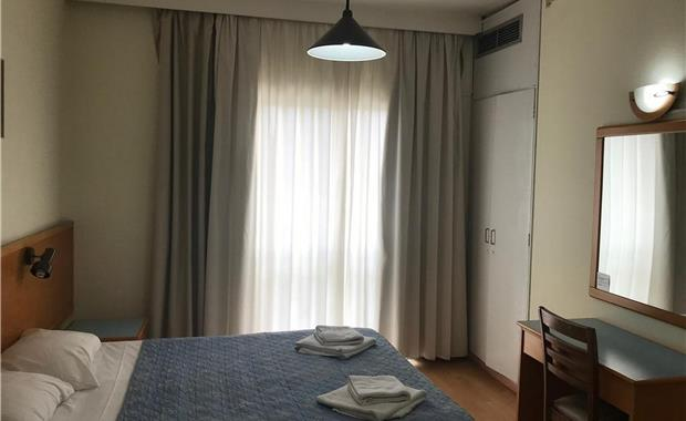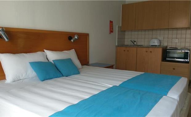 - Studio (15 кв.м, одна двуспальная / две односпальные кровати, диван, мини-кухня, балкон, вид на улицу / на бассейн; макс. 3 чел.)