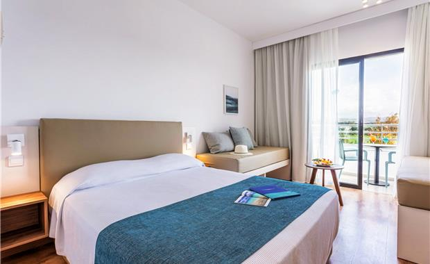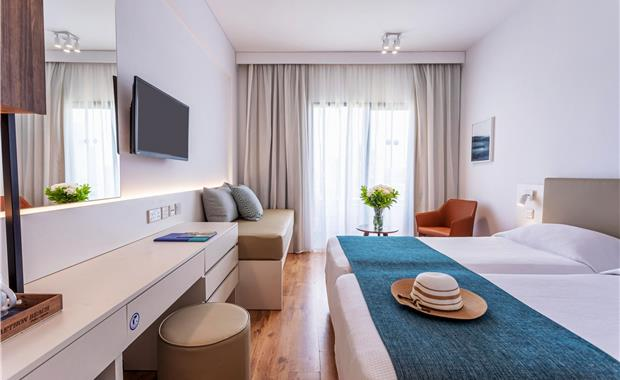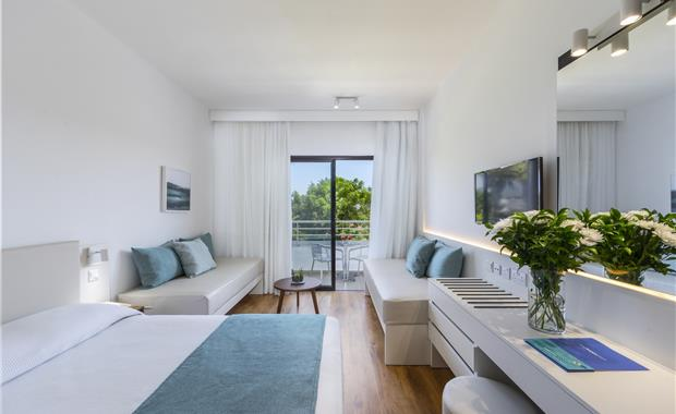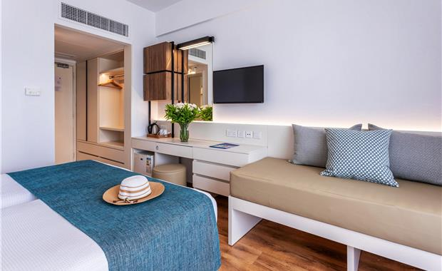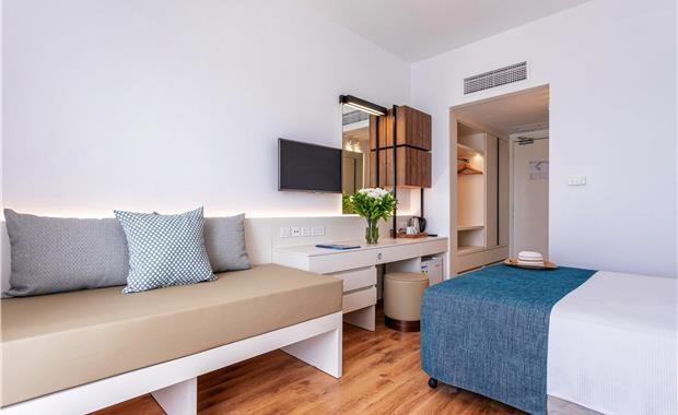 - Standard Rooms (19 кв.м, макс. 3 взр. или 2 взр. + 2 реб.) с видом на море или на горы, с двуспальной или 2 односпальными кроватями, в качестве доп. кровати раскладной диван.
