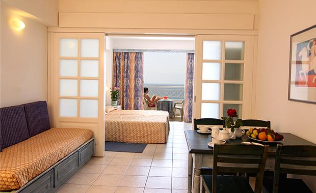 - Studio Sea View (35 кв.м, макс. 2 взр.+2 реб.) однокомнатный номер, слайдовая дверь отделяет зону спальни от гостиной зоны, балкон, вид на море.