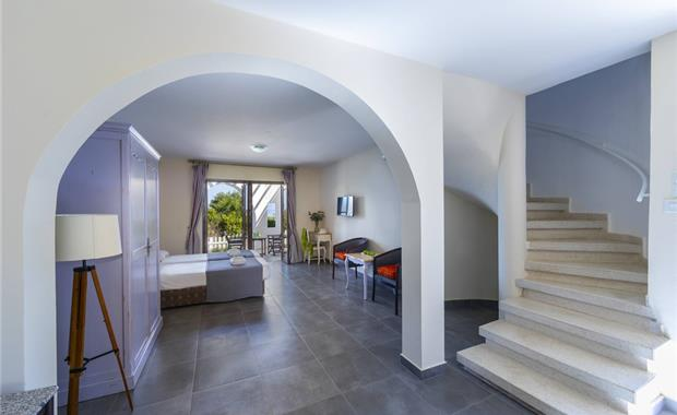 - Family Duplex Sea View Room (52 кв.м, состоит из спальни на верхнем этаже и гостиной с кухней - на нижнем, двуспальная кровать / 2 односпальные, раскладной диван в гостиной, балкон / терраса, макс. 4 взр. / 2 взр. + 2 реб.)