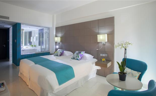 - Twin Land View/Pool View/Side Sea View/Sea View (28 кв. м, вид на территорию/бассейн/частичный на море/прямой на море, макс. 2+2 или 3 чел., однокомнатный, двуспальная кровать 200х200 см/2 односпальные кровати 100х200 см, доп. кровать – 100х200 см, напольное покрытие – плитка/ламинат, балкон, ванная комната с ванной)