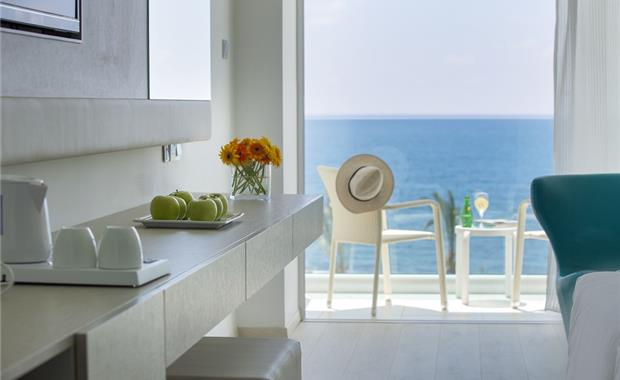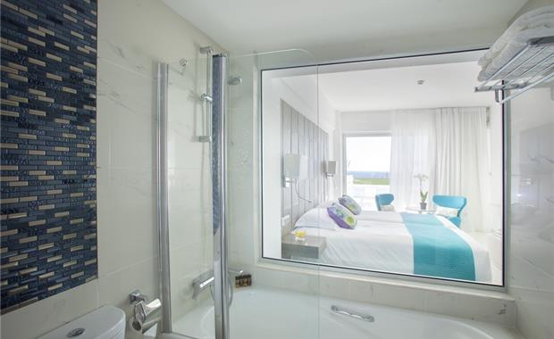 - Twin Front Sea View (28 кв. м, вид прямой на море, макс. 2+2 или 3+1 чел., однокомнатный, двуспальная кровать 200х200 см/2 односпальные кровати 100х200 см, доп. кровать – 100х200 см, напольное покрытие – плитка/ламинат, балкон, ванная комната с ванной)