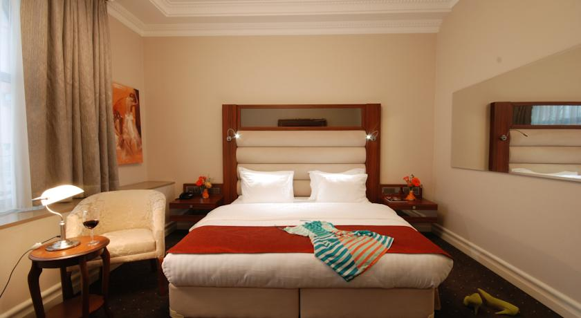 Номер Люкс : с большой кроватью с кондиционером, телевизором с плоским экраном, мини-баром мягкая мебель фен халат и тапочки и собственной ванной комнатой. В номере также имеется гидромассажная ванна. Предусмотрено дополнительное место. Номера с балконои, с которого есть вид на море, сквер и бульвар