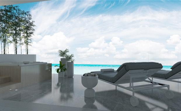 - терраса для загара с шезлонгами и зонтами