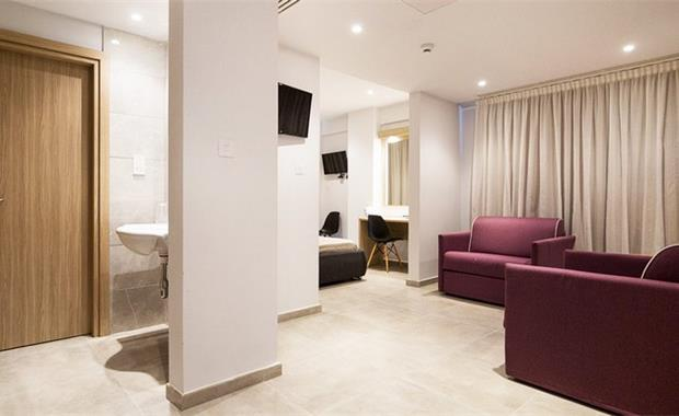 - Suite (32 кв.м, макс 4 чел.) – номер частично разделен на зоны гостиной с 2 раскладными креслами и спальни с двуспальной кроватью. В номере 2 телевизора, номера с прямым видом на море.