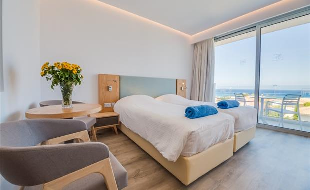 - Double / Twin Sea View (24 кв.м, однокомнатный номер с одной двуспальной (2,0x1,6) или двумя односпальными кроватями (2,0x0,9), доп. место - раскладной диван (1,9x1,5), балкон, вид на море, макс. 3 взр. / 2 взр. + 1 реб.)