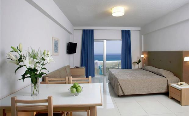 - Studio With Sea View (30 кв. м, номер разделен на зоны спальни с кроватью "king-size" и гостиной с раскладным диваном и кухонным уголком, балкон/терраса с видом на море; макс. 3 чел.)